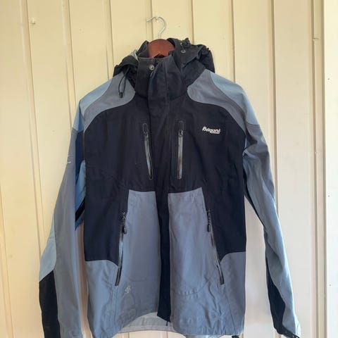 Pent brukt, hvit anorak fra Bergans med lyseblå/turkise detaljer i størrelse L. Modell GJENDE. Dette er en skalljakke-modell (shell) som er vanntett, vintett og pustende.
