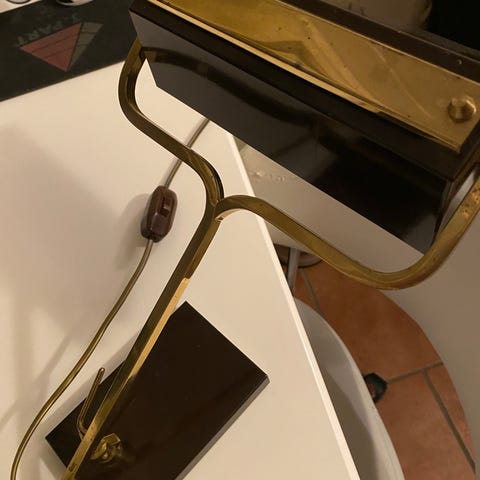 Selger en gammel skrivebordslampe, vet ikke når den er fra. 40-50-tallet kanskje? Den kan justeres oppe og nede. Det er noe rust på den ene siden, men så er den til gjengjeld ganske gammel. Man kan sikkert pusse den opp hvis man har kunnskaper om sånt. Jeg liker den godt, men må kvitte meg med en del ting.