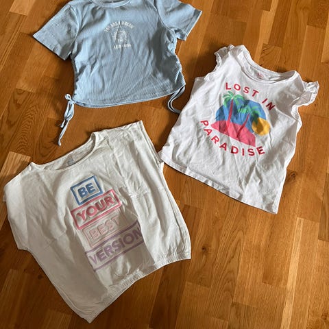Blandet merker T-skjorter, topper, gensere og kjoler for jente i størrelse 140. plus mange gensere, bukser atc som ikke er på bilde Inkluderer flere farger og design, som rosa, gul, stripete, oransje og grå. Materialer og merker varierer. Pent brukt