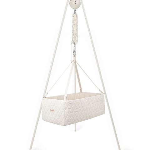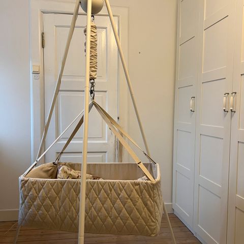 Den vugger barnet ditt opp og ned i ei romslig kurv.