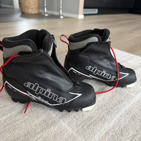21 cm lange skisko fra Alpina. Kjenner ikke skostørrelse men skoene passer 3 - 5 åringer. Brukt av to barn.