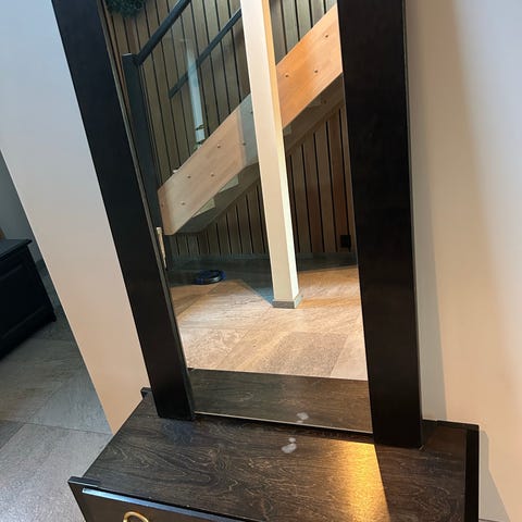Speilkommode med glassplate. Det er en liten skade i plata, se bilde. Høyde til glassplate er 76cm og til toppen 153cm.