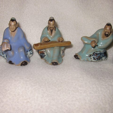 Commedia d’arte. Fire morsomme figurer fra Tadsjikistan. Brent leire. Malt. Ca 12 cm høye. Selges samlet.