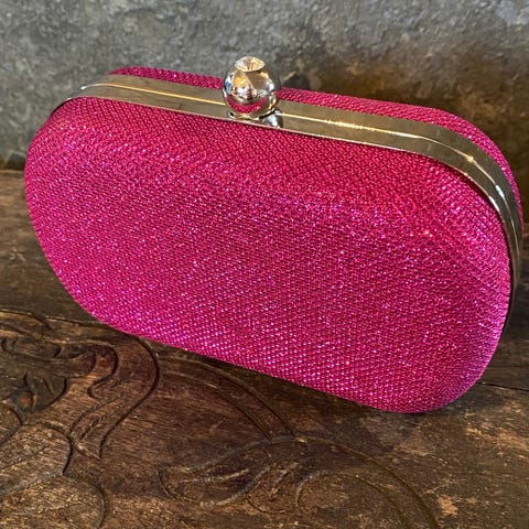 Rødt stoff med håndsydd broderier av perler og krystaller. One of a kind clutch som garantert ingen andre har.