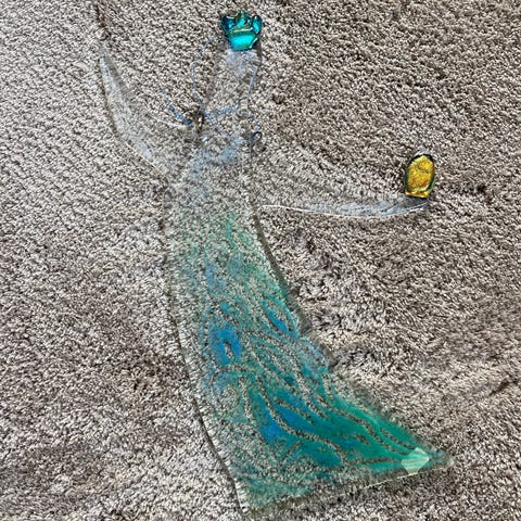 Blå glasskunst med oppheng.Ser ut som et øye. .