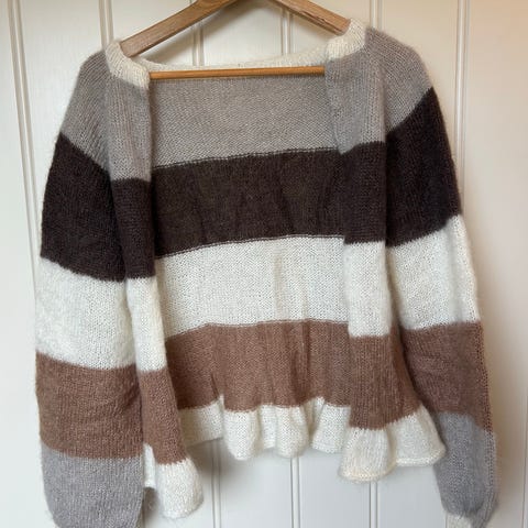 Strikket Sorbet cardigan i str S, men lengden til M. Strikket i Duo fra Sandnes garn, så salgspris tilsvarer kun pris på garnet.