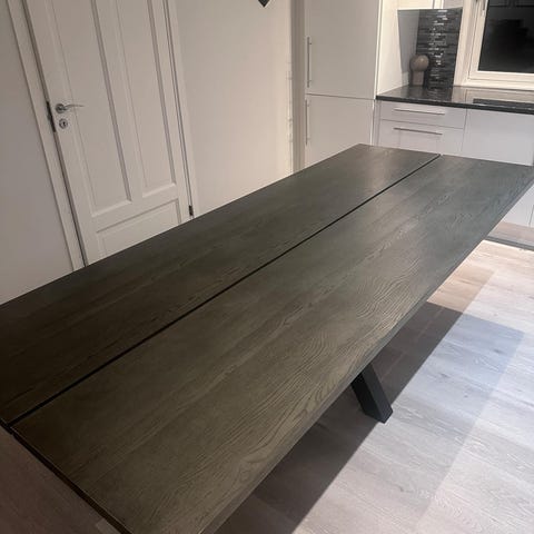 Flott spisebord kjøpt nytt 2022 selges grunnet plassmangel. Står demontert og brukes ikke i det daglige. Fremstår som ubrukt. Ikke mulighet for å forlenge med tilleggsplater. 6 stk stoler medfølger ikke men kan kjøpes for 1500kr ekstra om ønskelig. Stolene selges ikke utenom bordet.