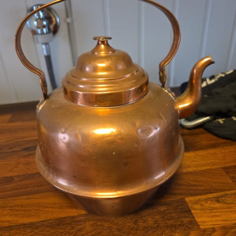 Liten kobberkjele selges. Noe patina, en liten bulk og ellers i grei stand.