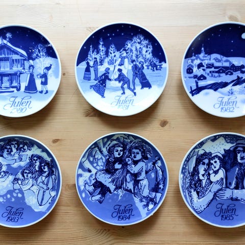 Mangler platte fra 1975. Liten skade på platte fra 1994 (se bilde). 6 av plattene har monterte oppheng. Kan pakke godt og sende.