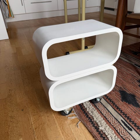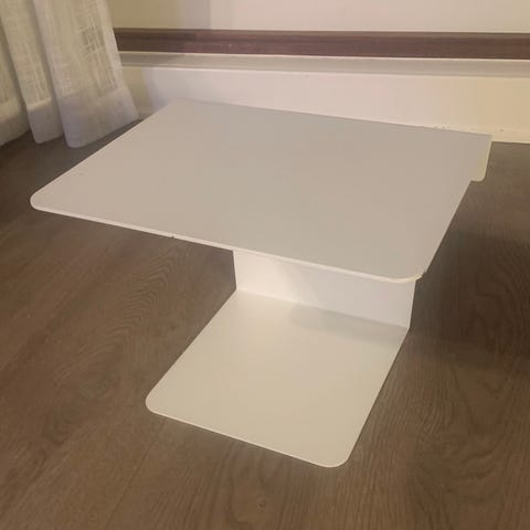 Hvit hylle/nattbord. Laget i metall, kan derfor brukes magneter på.