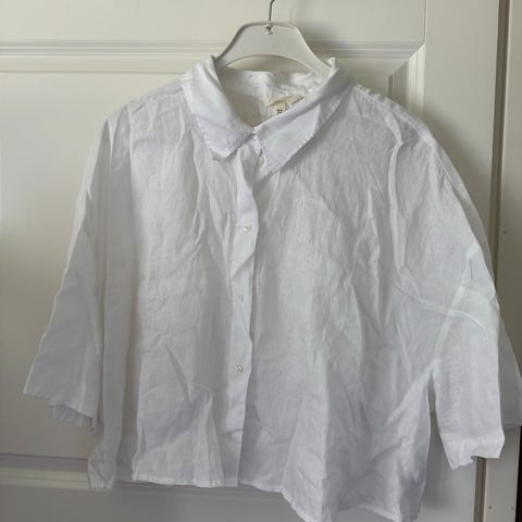 Fin hvit bomullsskjorte fra JJXX selges. 100 % bomull. Kort modell, med knapper og lomme på brystet. Skjorten er dessverre ikke strøket.