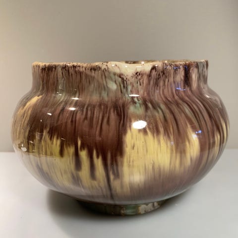 Brun hovedfarge, med spennende glasur som ser ut til å være helt over i lysere farger.