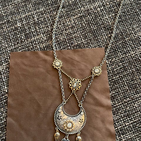 Halssmykke med langt kjede fra Arts & Crafts. Størrelsen på selve smykket er ca 4 x 4,5 cm. Kan evt sendes som vanlig brev.