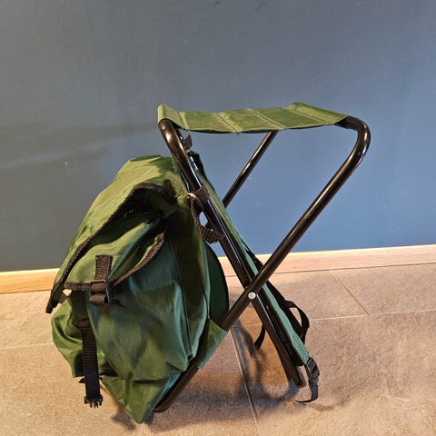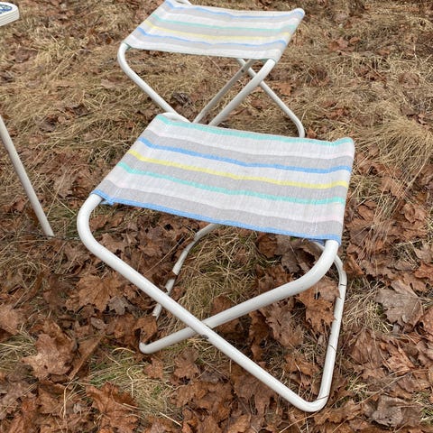Retro campingkrakk i tre med fargerikt, stripete stoff. Stoffet har noen merker, men ellers helt. Krakken kan slåes sammen.