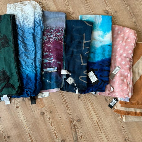 Rett, nokså smal. Mangler vaskelapp, antaelig 100% bomull. Mørk grå med tryk over det hele. Ubrukt!