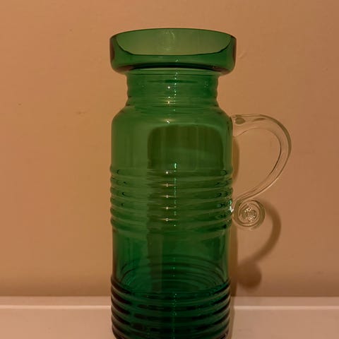 Vintage grønn karaffel selges for 235 kroner (høyde 27 cm, stemplet BF under). Fraktkostnader: PostNord - 69 kroner. Betaling via vipps.