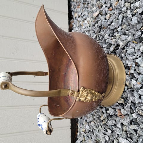 Vannkanne i messing/kobber på utsiden, trolig tinn på innsiden?. Brukt til å vanne blomster.