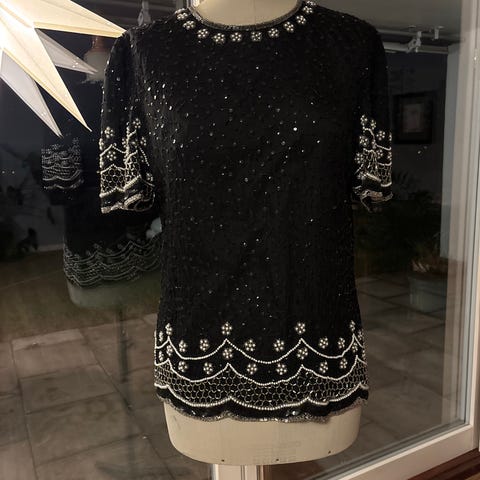 I silke og paljetter. Merket M, vil si den passer en 36-38.