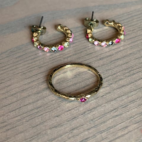 Smykker, armband og øredobber selges samlet kr 180,- Åtte par øredobber, ett smykke og to armband; alt er gullbelagt.