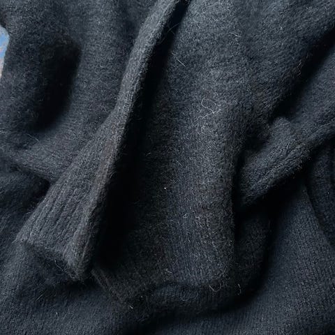 Kabelstrikket genser med oversized passform. Genser er svart og har rund hals. Det har langt erme og ribbestrikk ved ermeslutten og i nedre kant.