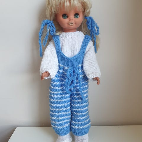 GUTTEDRESS til Baby Born dukke 43 cm, 415 kr. Består av selebukse med lomme på magen, genser, lue og sokker + søt liten Cabouchon pin. Strikk i livet. Strikket i Viking Baby Ull og Baby Merino. Pent arbeid. Porto kommer i tillegg.