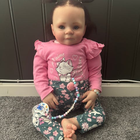 En vakker og realistisk samlerdukke fra den anerkjente tyske kunstneren Gerlinde Feser. "Leoni" er en nydelig dukke med mørk hudtone, detaljerte trekk og et uttrykksfullt ansikt som er typisk for Fesers fantastiske håndverk.