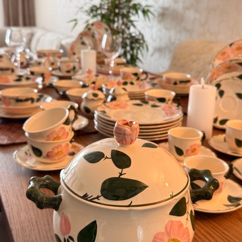 Villeroy&Boch , middagsservise til minst 15 personer, kaffe til 6 pers. Selges helst samlet. Lokk til sukkerskålen mangler. Det følger også med en terrin som ikke hører til, men også har et rosemotiv.