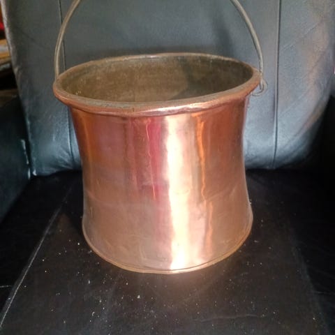 Gammelt spann i kobber. Med fin fingerskjøting i siden . Hel og fint. Diameter 20 cm. Høyde. 20 cm . Med hank 27 cm.