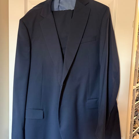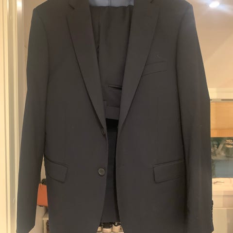 Blå dress (jakke og bukse)fra Dressmann selges. Dressen ble kjøpt ny i fjor, og har vært brukt 1 gang. Jakke har str 60 Short, og bukse str 38/30.