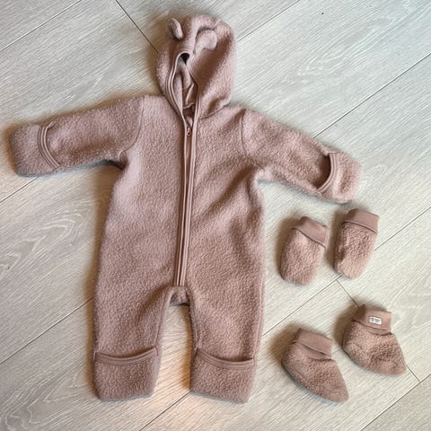 Settet er i str 62/68 og er i 100% merinoull. Kontrastfarger på ermene og tekst på bryst "Apres sleep".