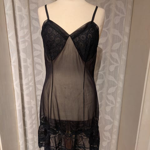Finsk design, Finnprofil. Mykt stoff, polyamid. Ser nesten ikke brukt ut. Fine blondedetaljer foran på brystet og nederst. Lang splitt på siden nederst. Lang kjole.