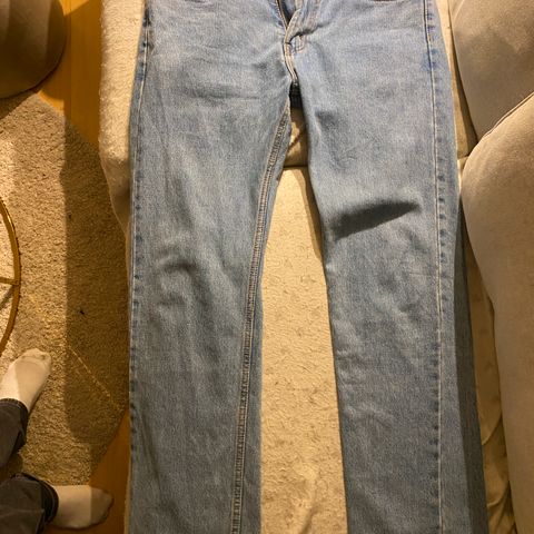 Noen flekker og litt slitasje på buksene, men generelt i grei stand.