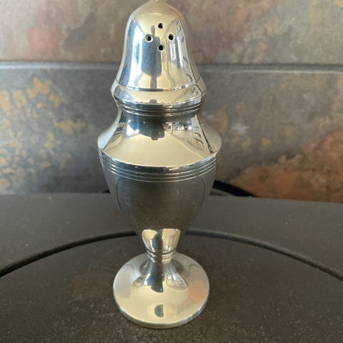 Sukker-drysser/strøer sølvplett. Merke 13 i lokk og bunn av strøer. Høyde ca 16,5 cm, bredde ca 7,5 cm. Brukt/bruksmerker/flekker.