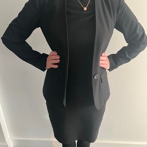 Nydelig Marie Philippe skjørt i fargen sort med tynne grå striper. Smal passform og fin lengde til over kneet. Skjørtet er foret. Lukkes med skjult glidelås bak.