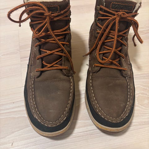 Pent og lite brukte vintersko til ungdom/herre størrelse 42. Brun/svart. Nylig impregnert. Mangler en av de tre øverste spennene, men dette er uten betydning for bruken. Innerfor av ull og poyester.