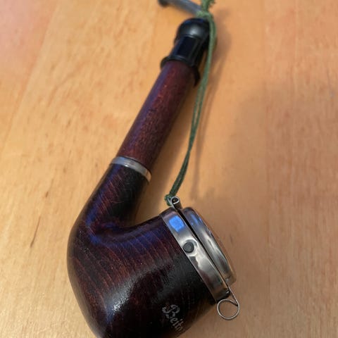 Meget spesiell tobakkspipe. Montert som en mini-flaske. Tre og metall. Gravert "Trøndelags utstillingen 1930". Lengde 15 cm. Ø3 cm. 95 år gammel men framstår i god stand, mindre sprekk i metallet, se bilde. Kan sendes kr. 100.