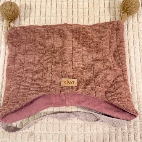 Hjemmestrikket lue i rosa med dusker, pannebånd, skjerf og sitteunderlag (helt nytt) størrelse 3 år. 100 kr