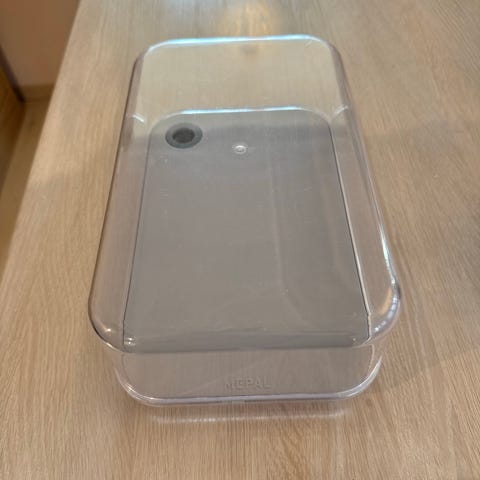 Osteklokke glassklar plast fra Clas Ohlson. Lengde 24 cm, bredde 16,5 cm, høyde 10,5 cm.
