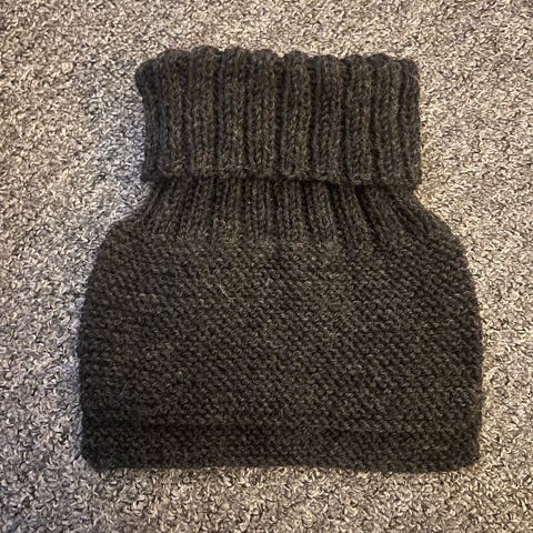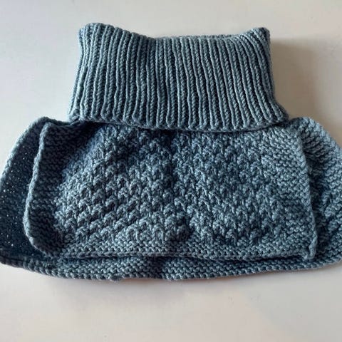Hjemmestrikket hals. Ubrukt. Strikket i Rauma Fivel i fargen burgunder. 100% norsk ull. Ca. 15 cm i lengde og bredde. Vil tro den passer bra til barn i alderen 2 til 3 år.