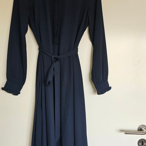Lilla kjole med et dragsko i midjen. Finnes og et bånd till som kan brukes som belte. Ca størrelse 38. God vidd i skjørtet og armene.