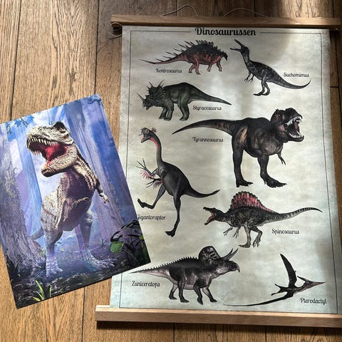 Selger dinosaurplakat fra little and pure. Kan snus på begge sider.