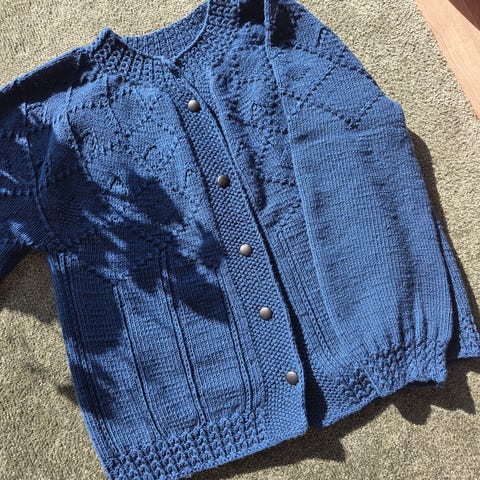 Strikket genser i mykt kløfritt tynt merino ullgarn. Str L-XL