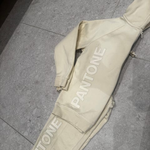 Off-white sett, college stoff, grønt med rosa print, str M, lite brukt.