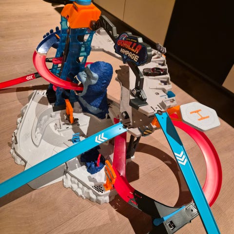 Zuru Metal Machines Gorilla Rampage lekesett -3 etasjers bilbane, helikopter, heis selges billig da barna mine har alt foe mye leker. Pent brukt.