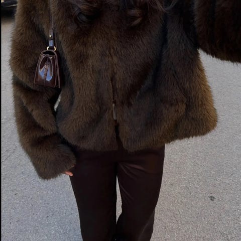 Didriksons jakke i brun farge, størrelse 34 for kvinner. Jakken har detaljer som to frontlommer med klaff og en pelskrage. Materialet gir varme og komfort, egnet til bruk i kaldere værforhold.