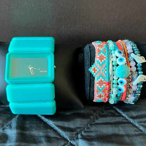 Mamma armbånd av glasskuler og annet materiale.