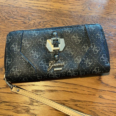Guess dame lommebok i svart med mønster og gullfargede detaljer. Lommeboken har flere kortlommer, rom for sedler og en glidelåslomme for mynter. Inkluderer en avtakbar håndleddrem for enkel bæring.