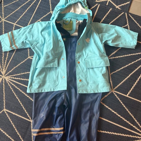 Blå bukse med intakte stropper under for, og blå-grønn jakke med avtagbar hette.