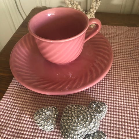 Rosa diamanter rundt hele koppen og en rosa bunnfarge