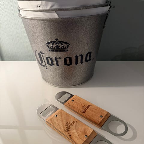 Flaskeholder til å ha flaske opp ned i glass. Merke corona extra. Fint til fest.